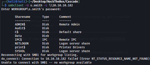Una vez obtenida la flag de usuario, vamos a a intentar saltar a otro usuario o al administrador. Vamos a utilizar smbclient para verificar los recursos compartidos para el usuario s.smith.