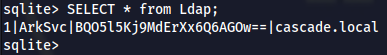 La tabla Ldap contiene el nombre ‘ArkSvc’ y lo que parece una password ‘BQO5l5Kj9MdErXx6Q6AGOw==’.
