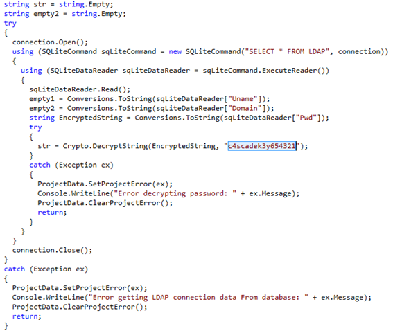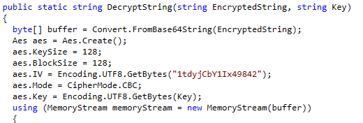 Con respecto a la DLL CascCrypto, el análisis del método DecryptString revelará el algoritmo de cifrado utilizado, en este caso, AES en modo CBC, así como el valor del vector IV: 1tdyjCbY1Ix49842. También nos confirma que la cadena final está codificada en formato Base64.