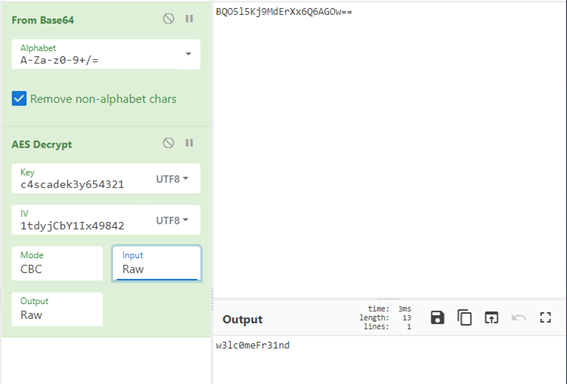 En el código fuente podemos ver que usa AES 128 bits o cbc. Con CyberChef podemos extraer la contraseña.