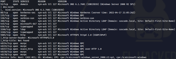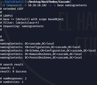Tenemos bastantes puertos abiertos. Sin embargo, Kerberos (88), LDAP (389) y SMB (445) son los más interesantes. Nmap ya nos da un poco de información sobre el dominio al darnos el nombre de dominio: cascade.local . Revisando rápidamente SMB, parece que no tenemos ningún acceso como usuario anónimo. Por lo tanto, revisemos LDAP y veamos si obtenemos alguna información útil.