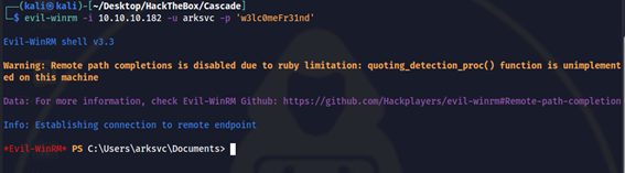 Con el usuario arksvc y la password w3lc0meFr31nd, vamos a intentar conectarnos a la máquina víctima a través de evil-winrm. Antes comprobamos si las credenciales son correctas con crackmapexec.