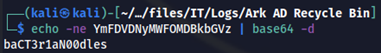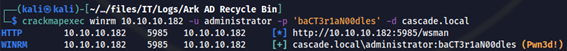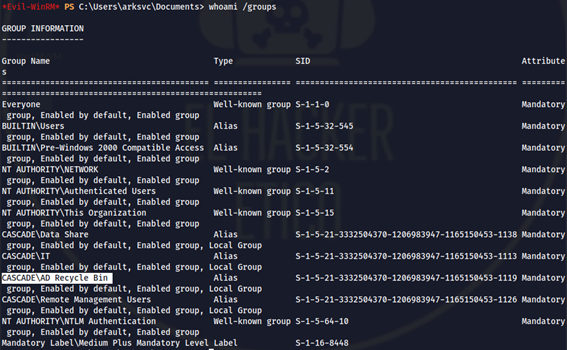 Si recordamos, TempAdmin se encontraba en la tabla DeletedUserAudit de la base de datos Audit.db. En la imagen del correo electrónico se dice que el usuario TempAdmin tiene la misma contraseña que el administrador, sabemos que este usuario fue eliminado y que se encuentra en la papelera de reciclaje. Recordemos también que el usuario arksvc es miembro del grupo llamado AD Recycle Bin.
