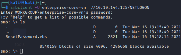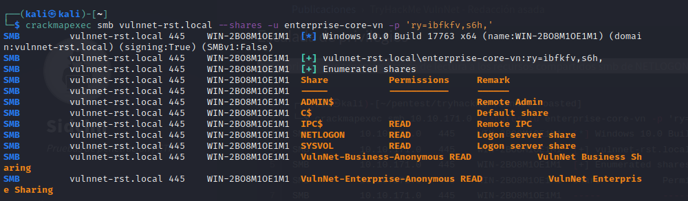 Descubrimos que tenemos acceso de lectura a los recursos compartidos smb de NETLOGON y SYSVOL con credenciales del usuario enterprise-core-vn.