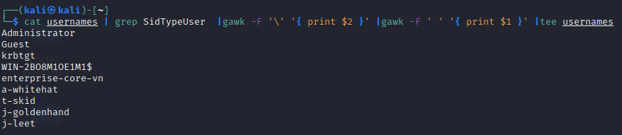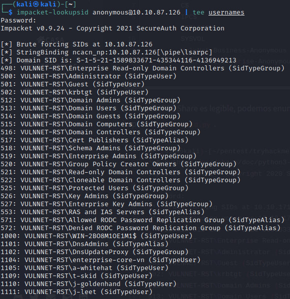 Dado que IPC$ es legible, podemos enumerar usuarios de dominio utilizando la tool impacket-lookupsid.
