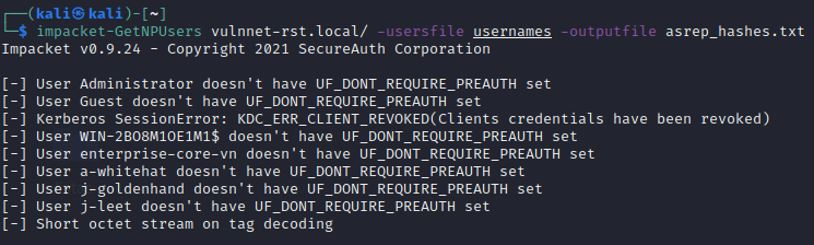 Podemos utilizar para ello la tool impacket-GetNPUsers, que sirve poara verificar si hay nombres de usuario válidos y que no requieran la autenticación previa de Kerberos.