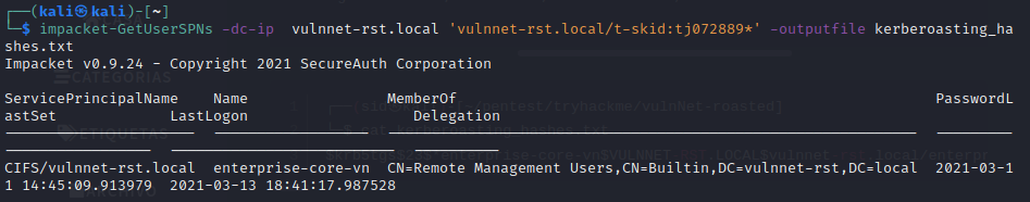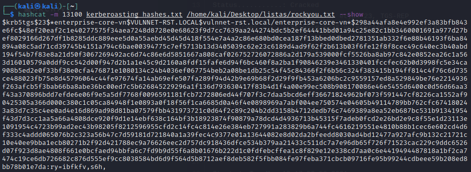 Dado que ahora tenemos un conjunto contraseña-usuario válido, podemos realizar un ataque de kerberoasting para obtener un hash KRB5 TGS para los nombres del SPN del dominio que se utilizan para identificar las cuentas de servicio en Microsoft Windows.