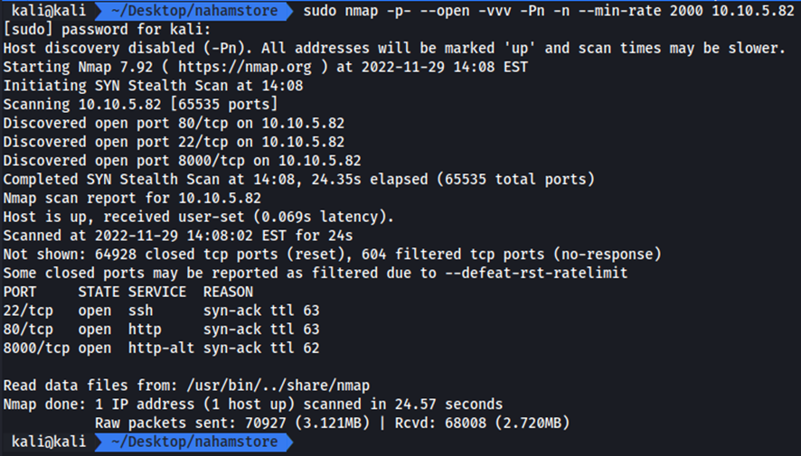 Comenzamos realizando un escaneo rápido de los puertos que tiene abiertos la máquina víctima.