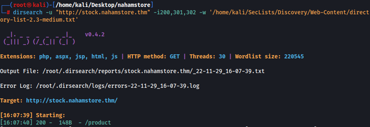 Seguimos enumerando los directorios de los distintos subdominios encontrados. Para ello, utilizamos la herramienta Dirsearch.