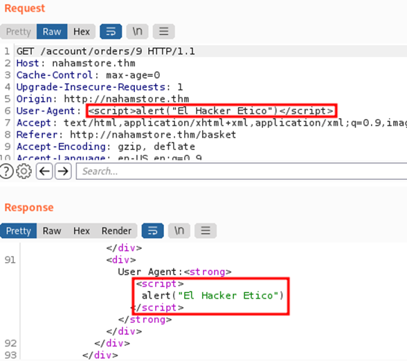 Vamos a realizar otro pedido pero en esta ocasión vamos a capturar la petición con Burp para cambiar el valor de User-Agent por una carga útil XSS.