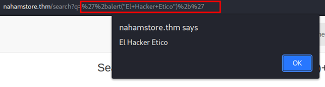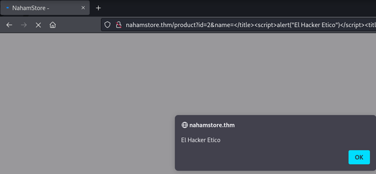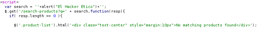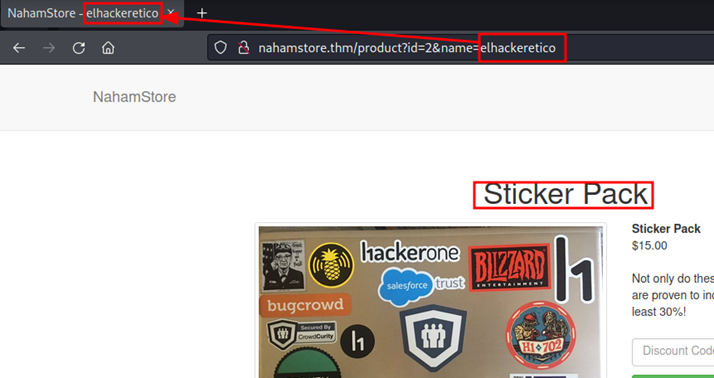 Al clicar sobre un producto de la página principal de la tienda, el nombre aparece en la barra de búsqueda como un parámetro GET. Este parámetro no controla el título pero se inyecta en la etiqueta <title> (se muestra en la pestaña de navegador).