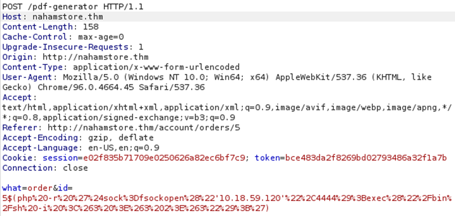 Segundo RCE conectado al número de pedido cuando hacemos clic en el botón “PDF Receipt”. Vamos a enviar una Reverse Shell a través del parámetro id=.