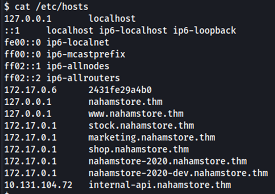 Un archivo interesante que hemos encontrado es /etc/hosts, donde podemos ver más subdominios aparte de los encontrados en la enumeración inicial y que pueden aportar información adicional.
