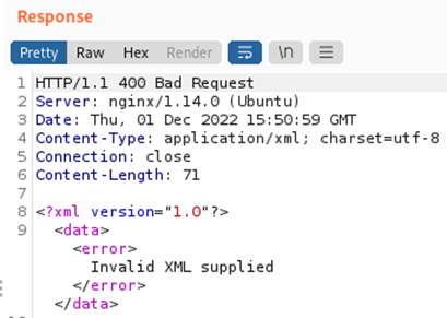 Podemos confirmar la vulnerabilidad XXE, ya que devuelve la misma respuesta que en la petición anterior.