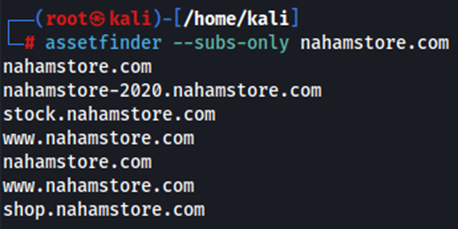 Los siguientes pasos serán la enumeración de subdominios y la enumeración de directorios. Comenzamos enumerando los subdominios. Para ello, vamos a utilizar la herramienta assetfinder. Como indican en la Web de Try Hack Me, para realizar el escaneo de subdominios, debemos cambiar .thm por .com (nahamstore.thm sería nahamstore.com para realizar la búsqueda.